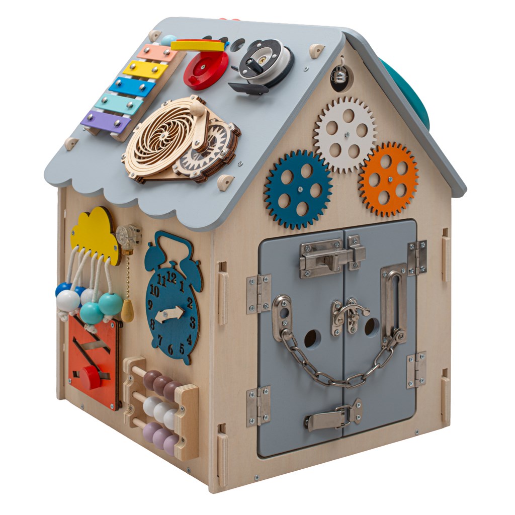 Každá strana domečku nabízí jinou sadu aktivit, čímž děti přirozeně motivuje ke zkoumání, manipulaci a samostatnému objevování.