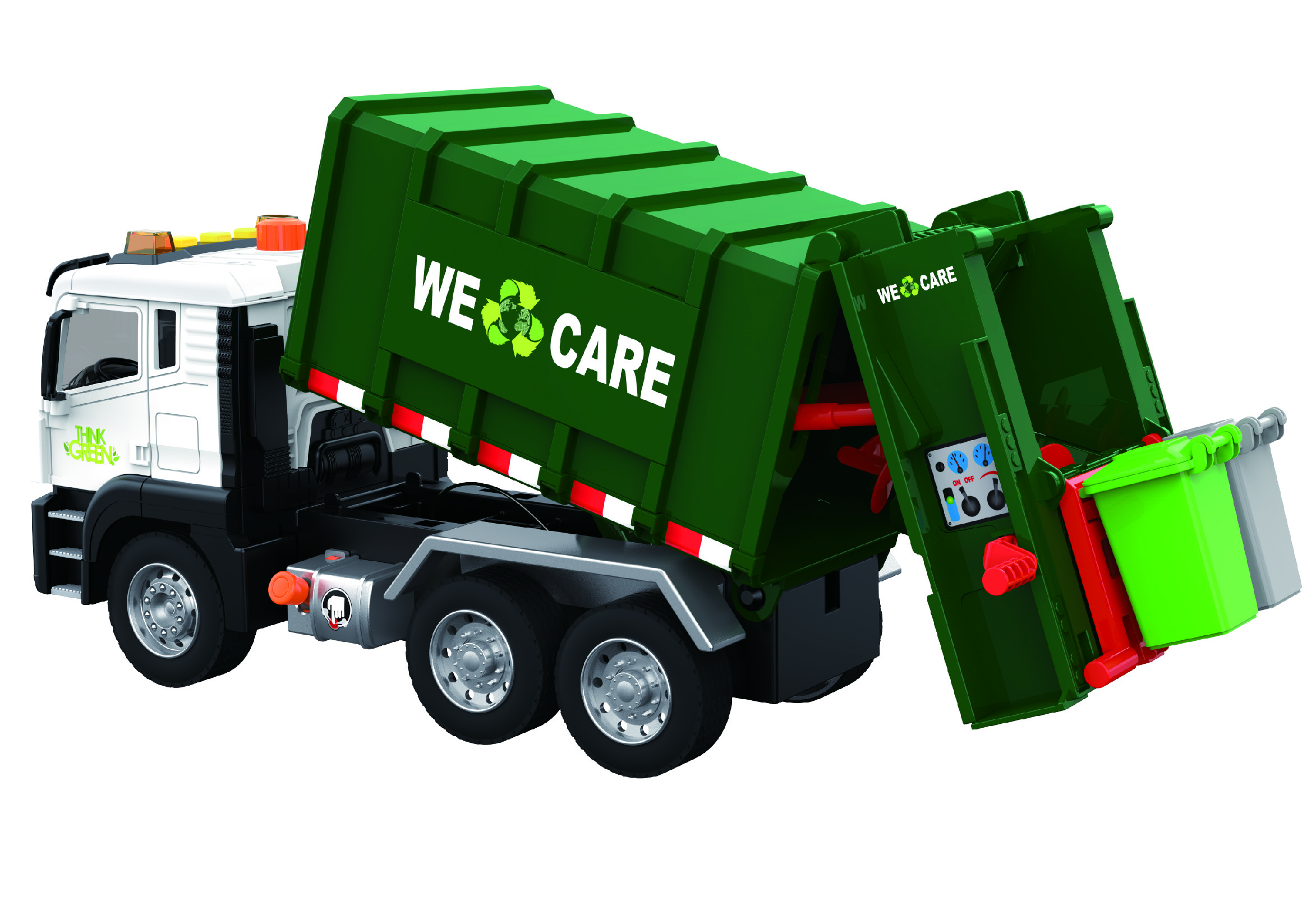 Auto úklidové s popelnicemi a efekty. Rozměry 31,5x12,5x16 cm. Na setrvačník. Světelné a zvukové efekty tlačítky na kabině. 3xAG13 baterie součástí. Manuální zvedání nákladové plochy velkým tlačítkem na kabině. Manuální pokládání nákladové plochy páčkou mezi koly. Součástí 4 popelnice a odpadky. Popelnice je možné vložit do zadní části auta a vysypat je do nakládací plochy dle obrázků na obalu.
