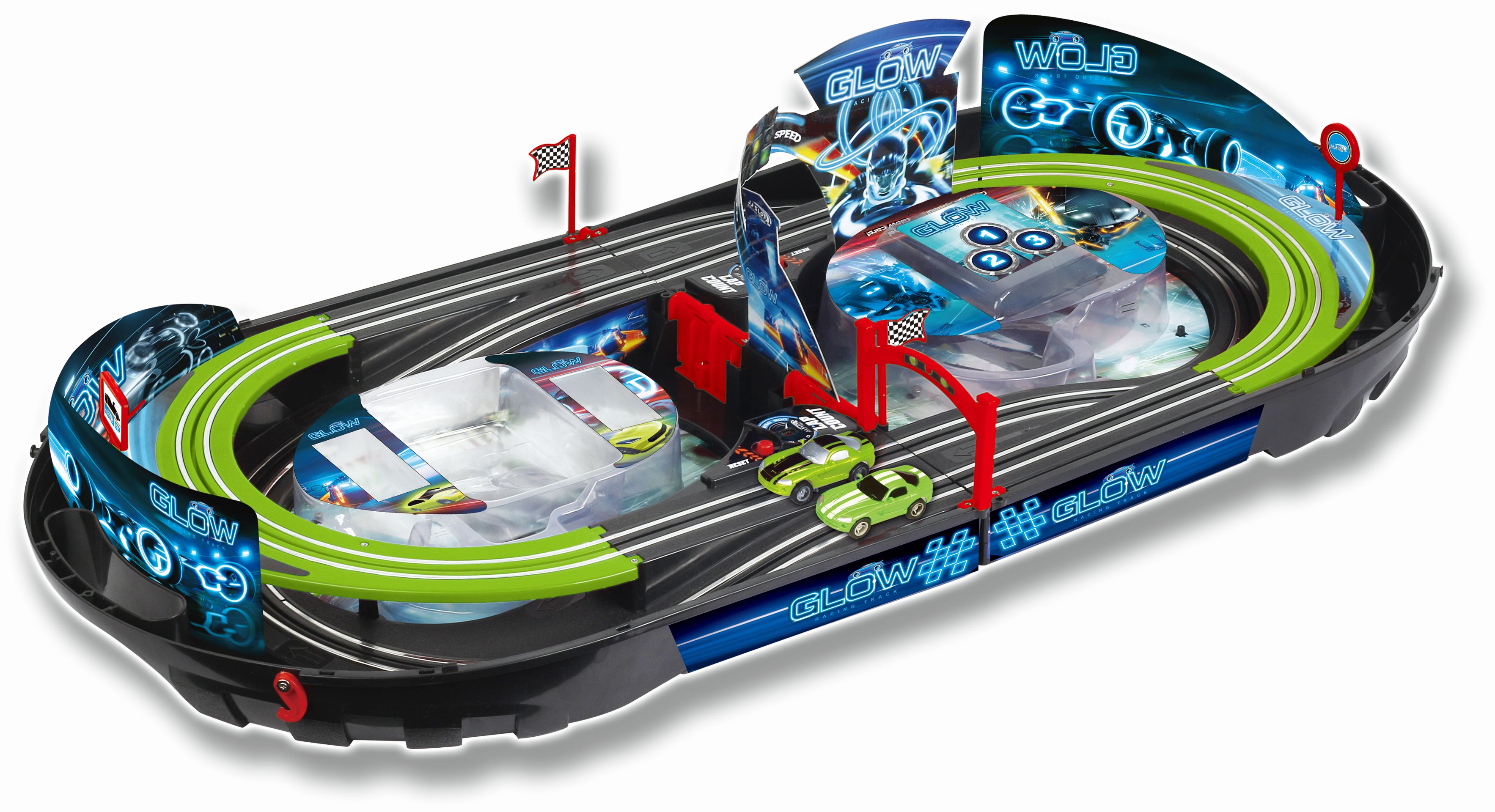 Autodráha rozkládací svítící. Rozměry 69x49,5x10,5 cm. 2 auta, 2 ovladače. 5xAA baterie nejsou součástí. Částečný obrázkový návod na použití na zadní straně obalu.
