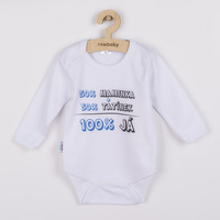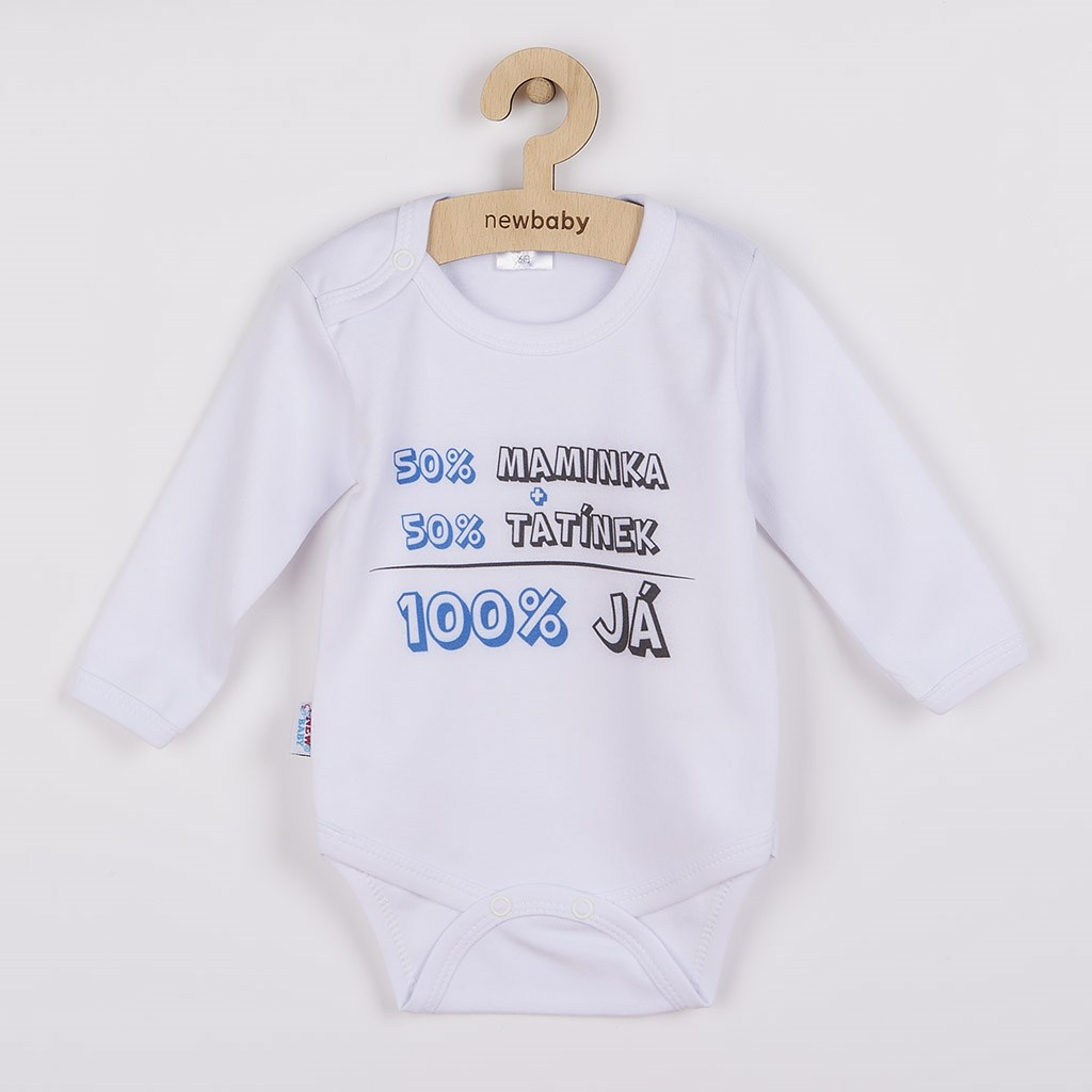 Originální bavlněné kojenecké body s dlouhým rukávem New Baby, s vtipným nápisem 50% MAMINKA + 50% TATÍNEK - 100% JÁ. Barvy použité k potisku jsou certifikované a vhodné pro miminka. Je vyrobeno z příjemného a kvalitního materiálu, ve kterém se bude Vaše miminko cítit příjemně. Body má zapínáni na cvočky na ramínku a mezi nožičkami, což usnadňuje oblékání a přebalování. Dopřejte Vašemu miminku vyniknout v originálním body. Složení: 100% bavlna. Rozměry: obvod kolem hrudníku cca 50 cm, délka rukávu cca 26 cm, celková délka cca 42 cm.