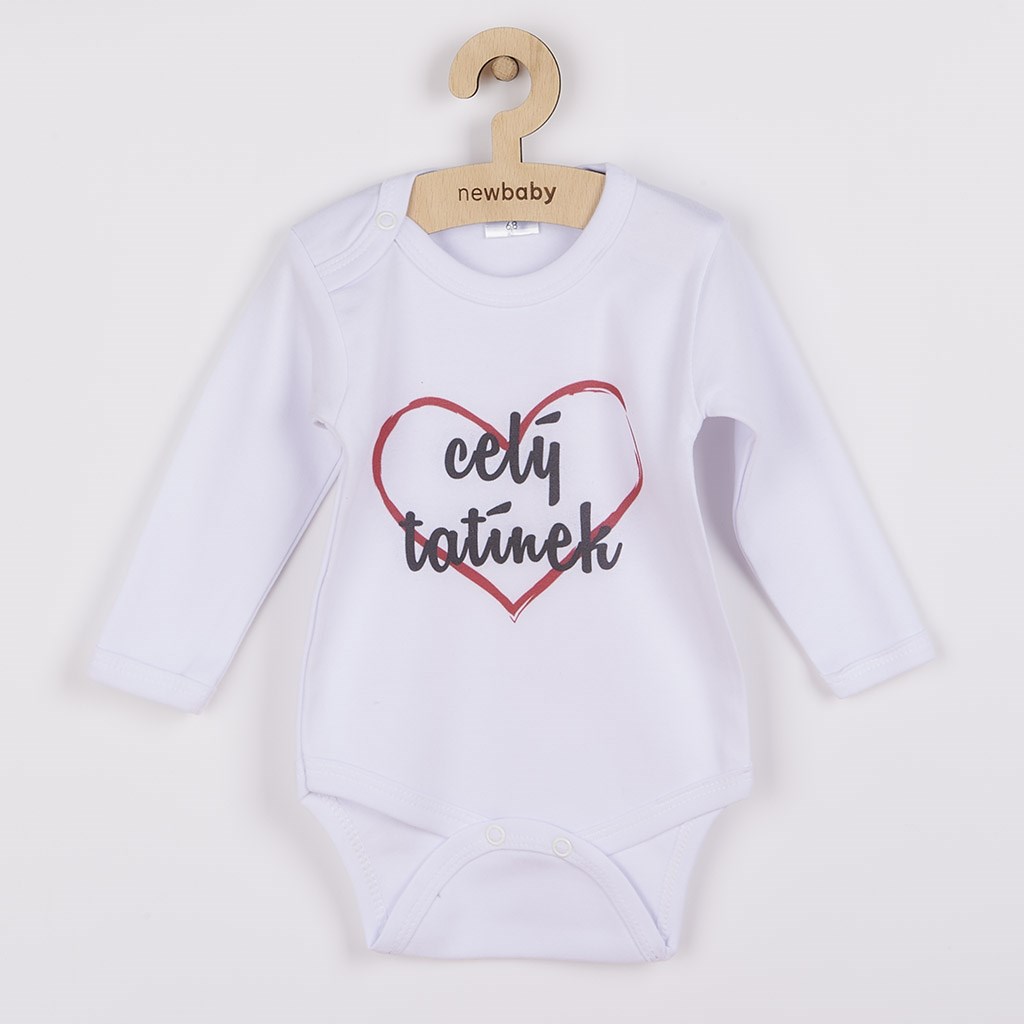 Originální bavlněné kojenecké body s dlouhým rukávem New Baby, s vtipným nápisem celý tatínek. Barvy použité k potisku jsou certifikované a vhodné pro miminka. Je vyrobeno z příjemného a kvalitního materiálu, ve kterém se bude Vaše miminko cítit příjemně. Body má zapínáni na cvočky na ramínku a mezi nožičkami, což usnadňuje oblékání a přebalování. Dopřejte Vašemu miminku vyniknout v originálním body. Složení: 100% bavlna. Rozměry: obvod kolem hrudníku cca 46 cm, délka rukávu cca 24 cm, celková délka cca 40 cm.