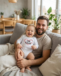Originální bavlněné kojenecké body s dlouhým rukávem New Baby, s vtipným nápisem celý tatínek. Barvy použité k potisku jsou certifikované a vhodné pro miminka. Je vyrobeno z příjemného a kvalitního materiálu, ve kterém se bude Vaše miminko cítit příjemně. Body má zapínáni na cvočky na ramínku a mezi nožičkami, což usnadňuje oblékání a přebalování. Dopřejte Vašemu miminku vyniknout v originálním body. Složení: 100% bavlna. Rozměry: obvod kolem hrudníku cca 34 cm, délka rukávu cca 16 cm, celková délka cca 30 cm.