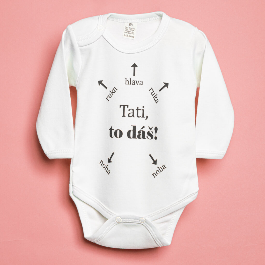 Originální bavlněné kojenecké body s dlouhým rukávem New Baby, s vtipným nápisem Tati, to dáš! Barvy použité k potisku jsou certifikované a vhodné pro miminka. Je vyrobeno z příjemného a kvalitního materiálu, ve kterém se bude Vaše miminko cítit příjemně. Body má zapínáni na cvočky na ramínku a mezi nožičkami, což usnadňuje oblékání a přebalování. Dopřejte Vašemu miminku vyniknout v originálním body. Složení: 100% bavlna. Rozměry: obvod kolem hrudníku cca 34 cm, délka rukávu cca 16 cm, celková délka cca 30 cm.