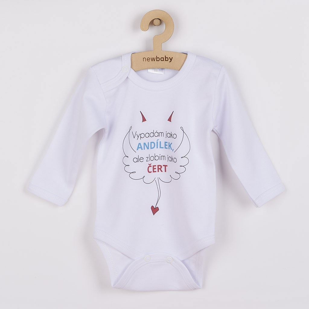 Originální bavlněné kojenecké body s dlouhým rukávem New Baby, s vtipným nápisem Vypadám jako ANDÍLEK, ale zlobím jako ČERT a zajímavou kresbou. Barvy použité k potisku jsou certifikované a vhodné pro miminka. Je vyrobeno z příjemného a kvalitního materiálu, ve kterém se bude Vaše miminko cítit příjemně. Body má zapínáni na cvočky na ramínku a mezi nožičkami, což usnadňuje oblékání a přebalování. Dopřejte Vašemu miminku vyniknout v originálním body. Složení: 100% bavlna. Rozměry: obvod kolem hrudníku cca 36 cm, délka rukávu cca 18 cm, celková délka cca 32 cm.