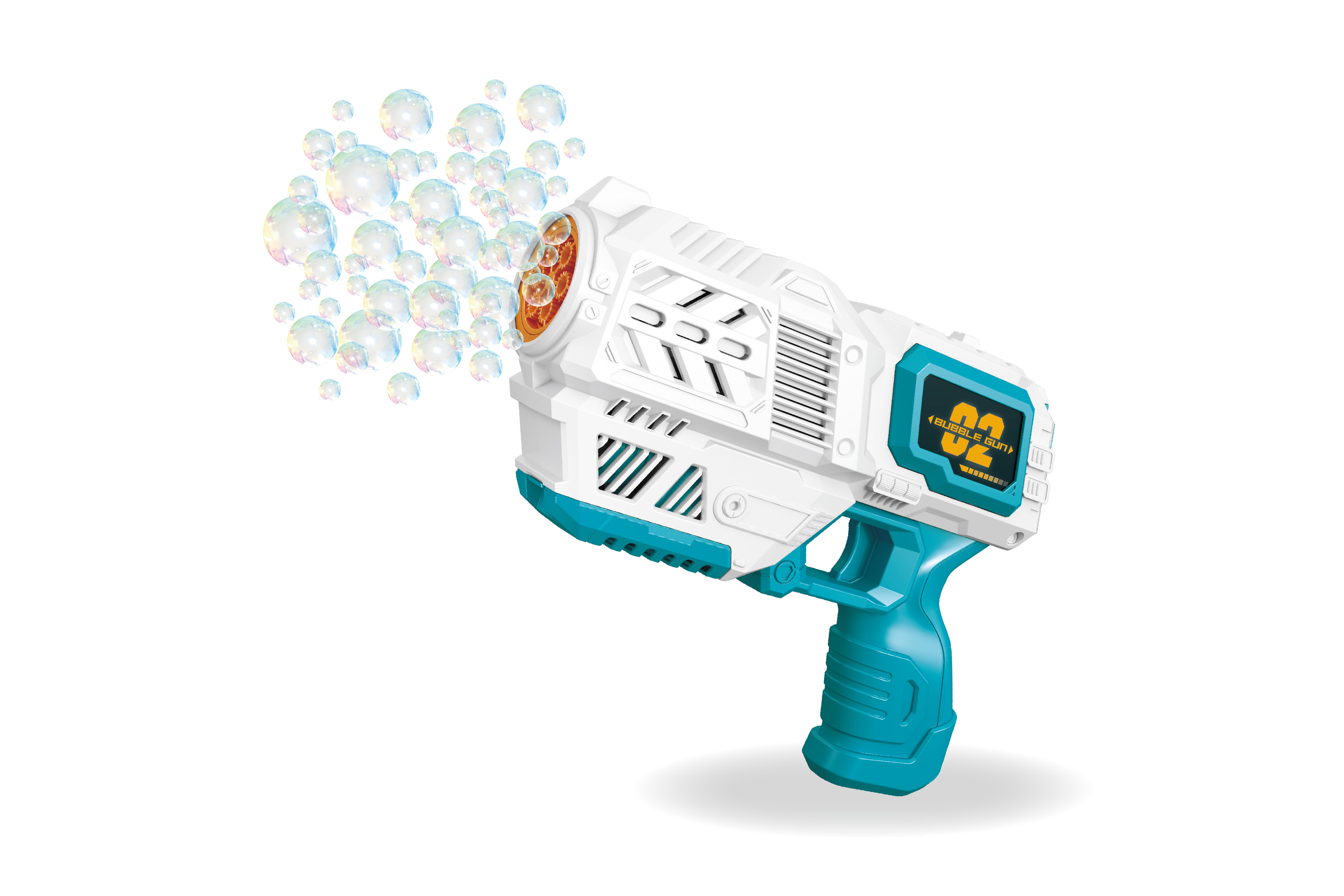 Bublifuk pistole. Rozměry pistole 19,5x14,7x5,8 cm. Nádržka o objemu 50 ml. baterie 4xAA nejsou součástí