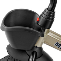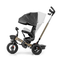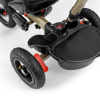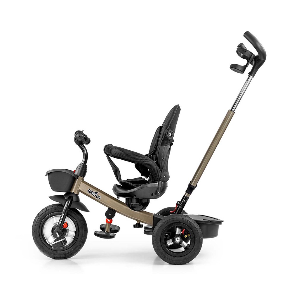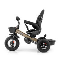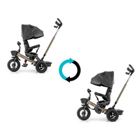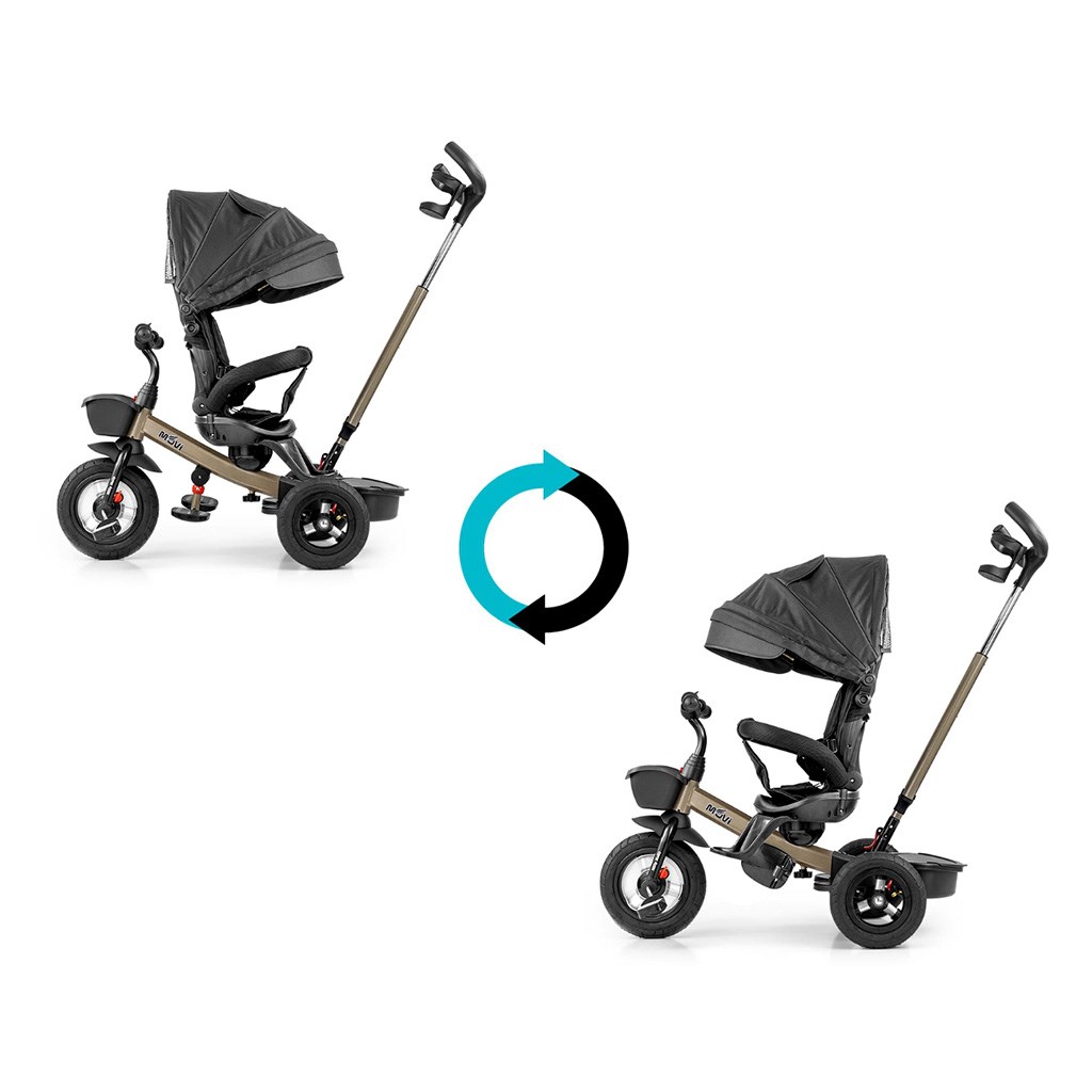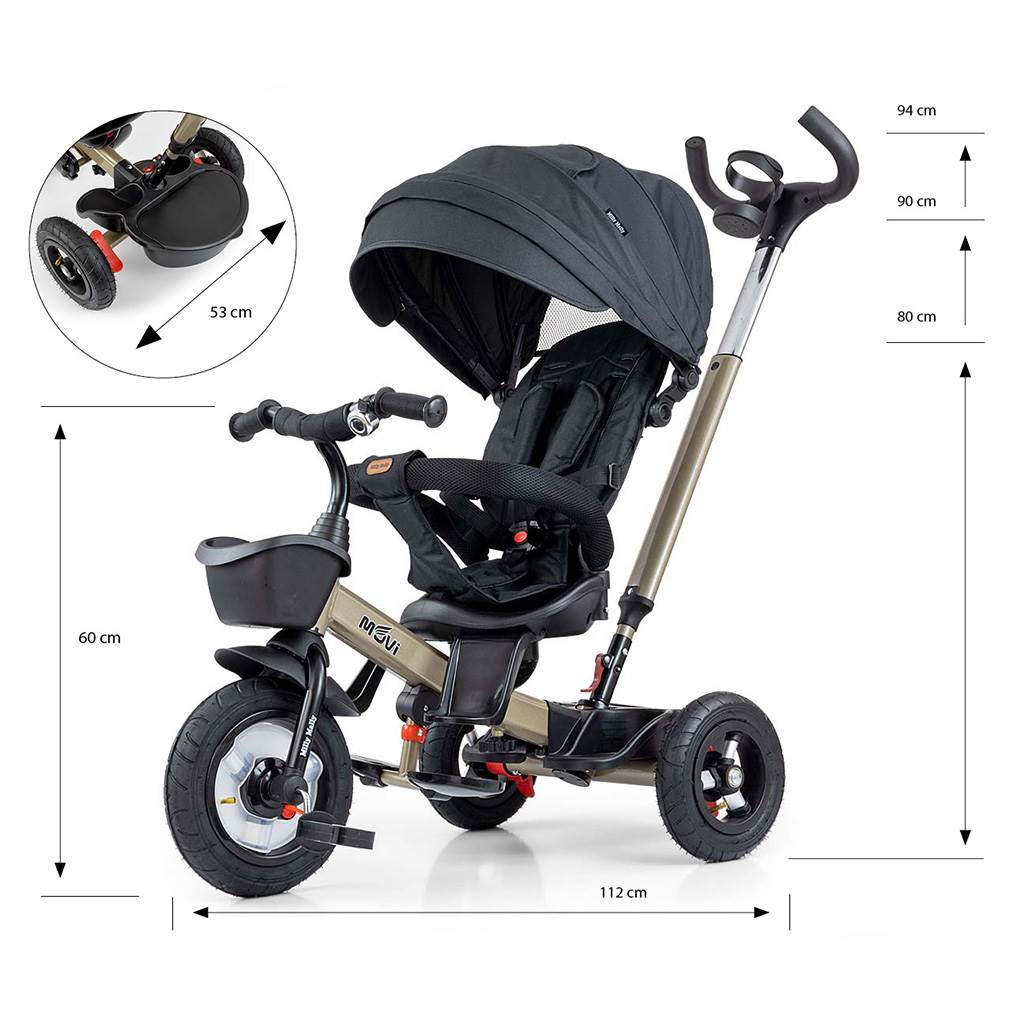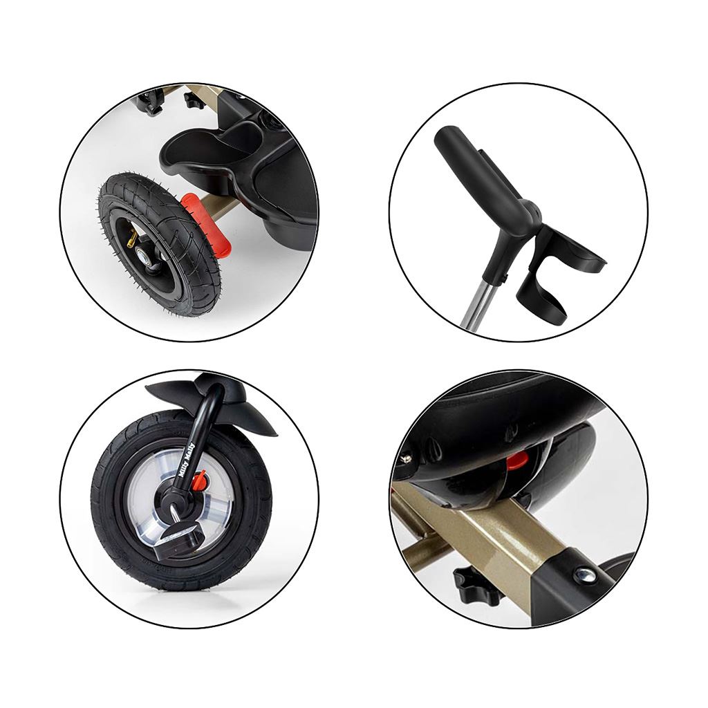 Je vyrobena z kvalitních a odolných materiálů. Má moderní konstrukci, pohodlné a ergonomicky tvarované sedadlo, které je otočné o 360 stupňů, což umožní dítěti cestovat ve směru nebo proti směru jízdy. O pohodlí a bezpečí během jízdy se stará bariérka, tříbodové bezpečnostní pásy, pohodlné stupačky nebo velká nafukovací kola, které skvěle absorbují rázy a poskytují dobrou přilnavost. Tříkolku může ovládat jak dítě, tak i rodič pomocí nastavitelné rukojeti pro tlačení. Po odebrání vodící tyče, sklápěcí stříšky, která chrání před sluncem nebo ostatních komponent bude sloužit jako tříkolka. Tříkolku lze používat rovněž jako alternativu golfového kočárku. Pro uložení hraček nebo potřeb pro dítě je zde praktický úložný košík.