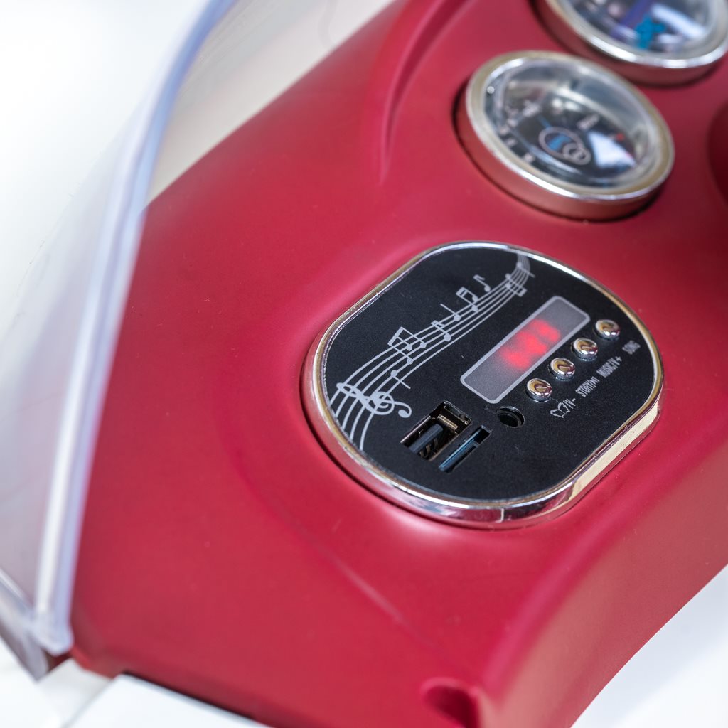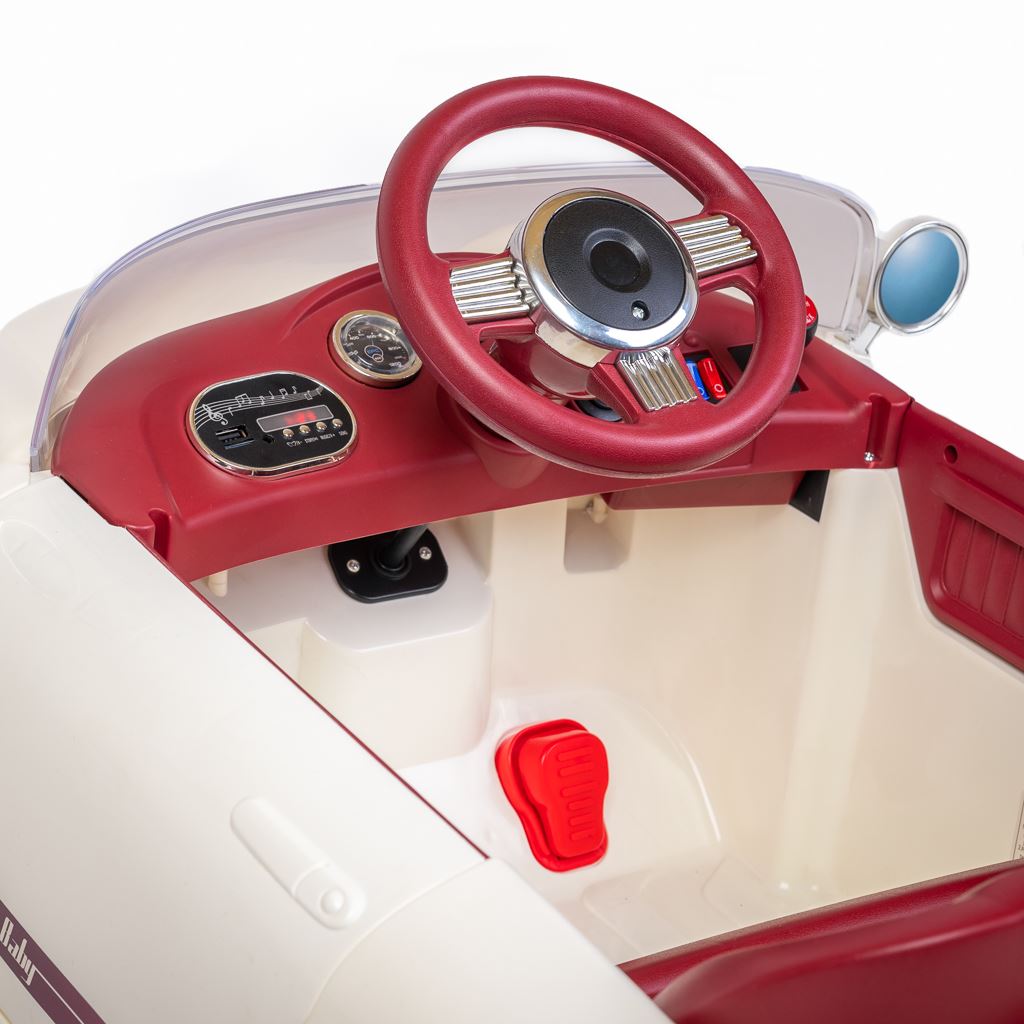 Specifikace: Rozměry balení: 109x55x32 cm Rozměry vozidla: 107x56x48 cm Baterie: 6V 4,5 AH Motor: 18W Hmotnost vozidla s balením: 12,6 kg Hmotnost vozidla: 10,6 kg Rychlost: 2-4,5 km/h Maximální nosnost: 40 kg Dálkové ovládání Předem nahraná hudba v autíčku Předem nahrané pohádky v autíčku Ochrana proti přebití baterie Vstup MP3, USB, TF Ovládání hlasitosti Připravte se na nekonečné hodiny vzrušení a dobrodružství s tímto kouzelným retro autem.