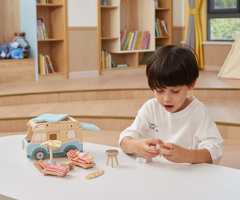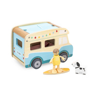 Dřevěný karavan je výjimečná hračka, která děti zavede do světa prázdninových dobrodružství a letních cest! Sada je inspirována bezstarostnými výjezdy k moři a díky precizním detailům a realistickým funkcím — jako jsou posuvné dveře, výsuvná střecha nebo střešní nosič na surfovací prkno — poskytuje dítěti hodiny zábavy plné kreativity. Karavan obsahuje bohaté příslušenství: dvě panenky, pejska, lehátka s polštářky, slunečník, gril, dokonce surfovací prkno, což umožňuje hrát všelijaké scénáře. Děti tak mohou ztvárňovat role týkající se cestování, odpočinku na pláži nebo organizování pikniku.