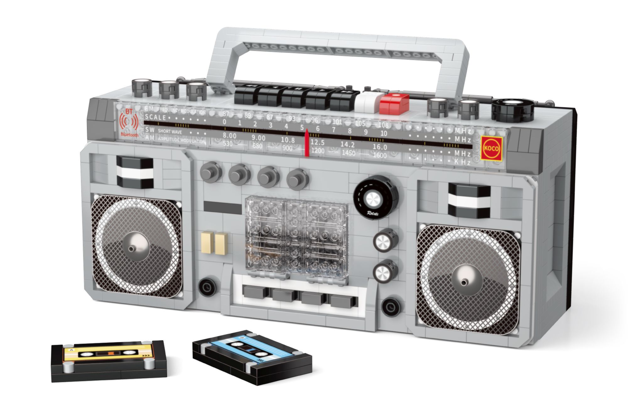 KOCO Stavebnice Kazetový přehrávač 1982 dílků. Rozměry 18,5x7,5x14,5 cm. Součástí 2 figurky. Obrázkový návod na sestavení součástí.