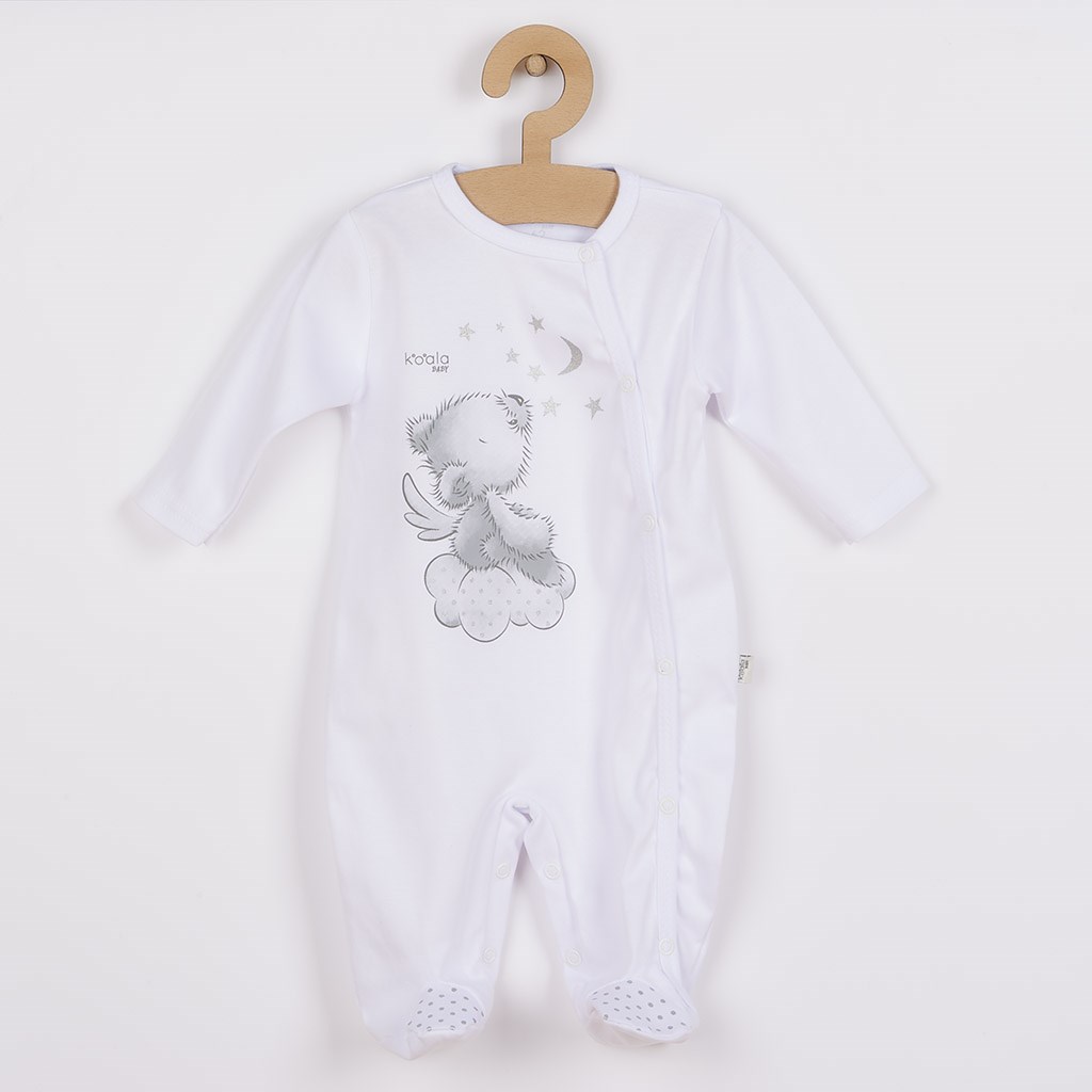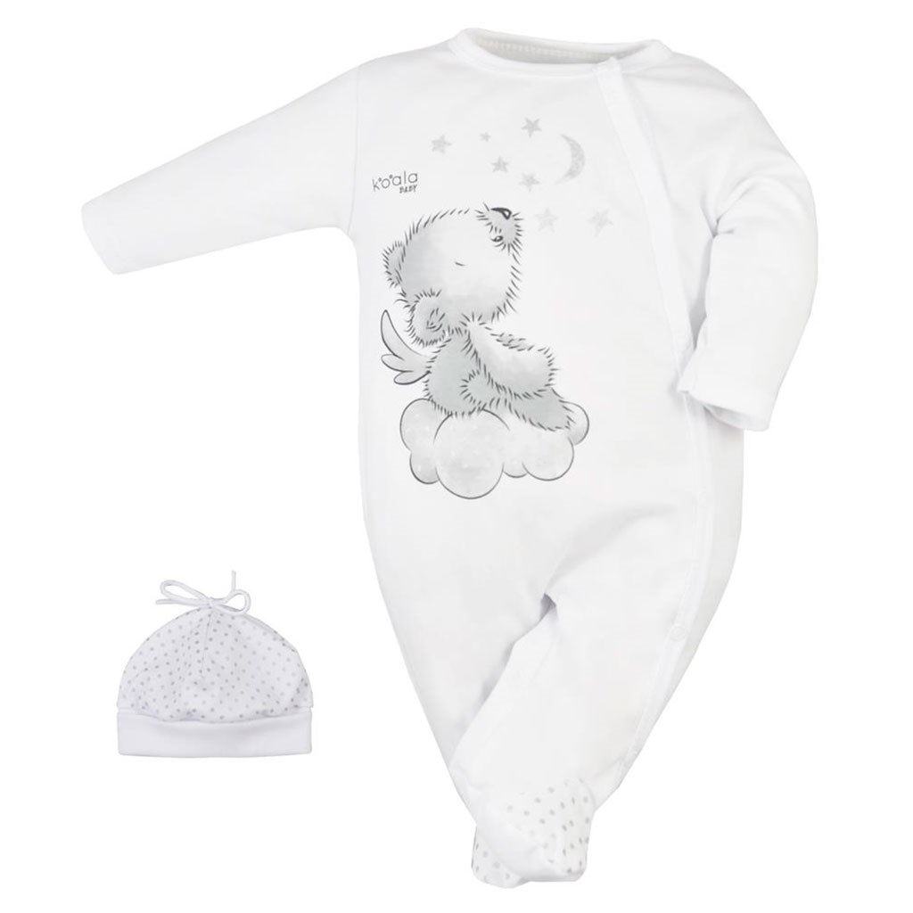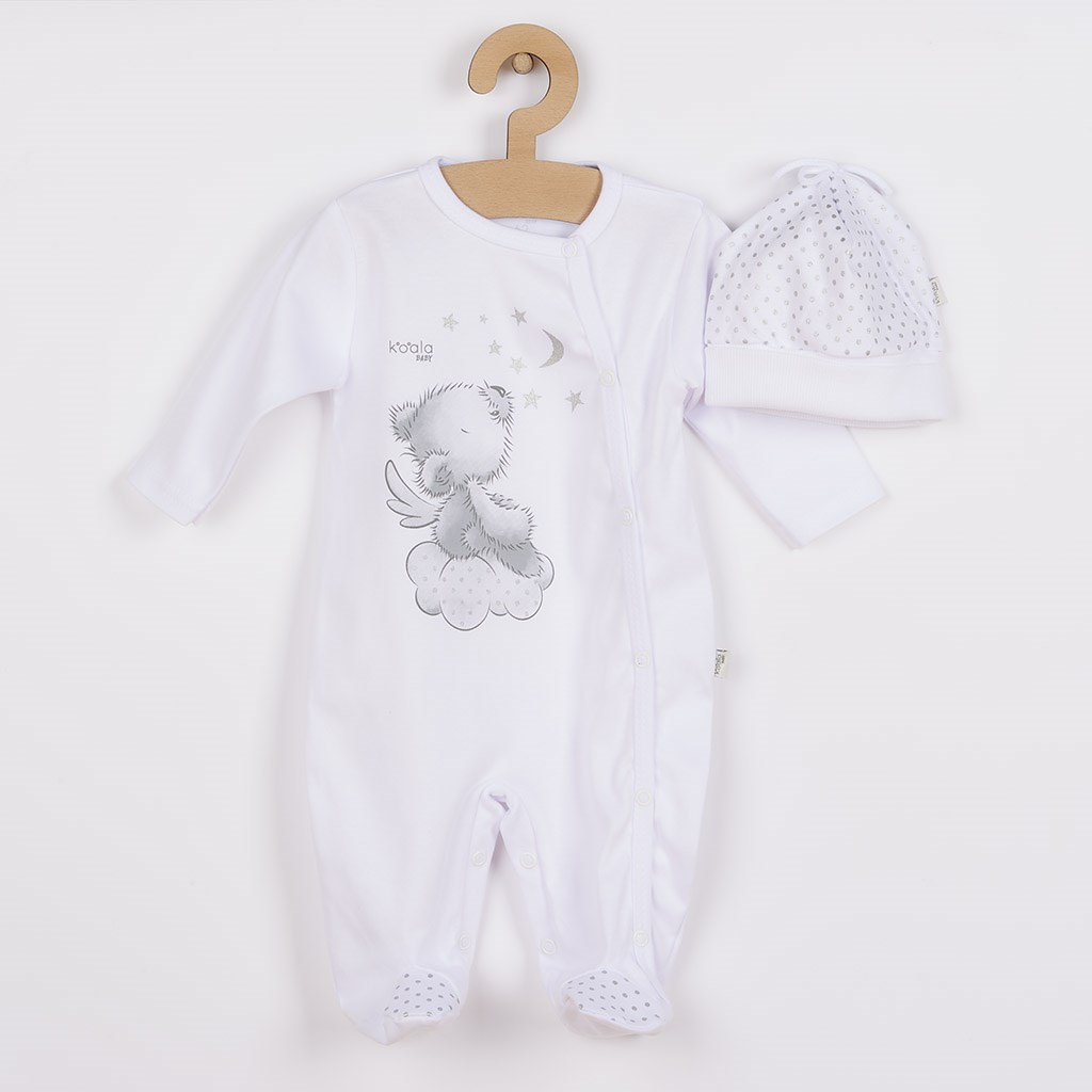 Okouzlující a jemný bavlněný kojenecký overálek s čepičkou Koala Angel. Overálek má moderní boční zapínání na cvočky po celé délce a mezi nožičkami. Je vhodný pro miminka už od narození pro svou jemnost a měkkost. Overal je zdoben obrázkem medvídka. Čepička s širším lemem krásně kryje ouška a je celopotištěná puntíky. Overal s čepičkou je vyroben z příjemného a kvalitního bavlněného materiálu, ve kterém se bude Vaše miminko cítit příjemně. Složení: 100% bavlna.