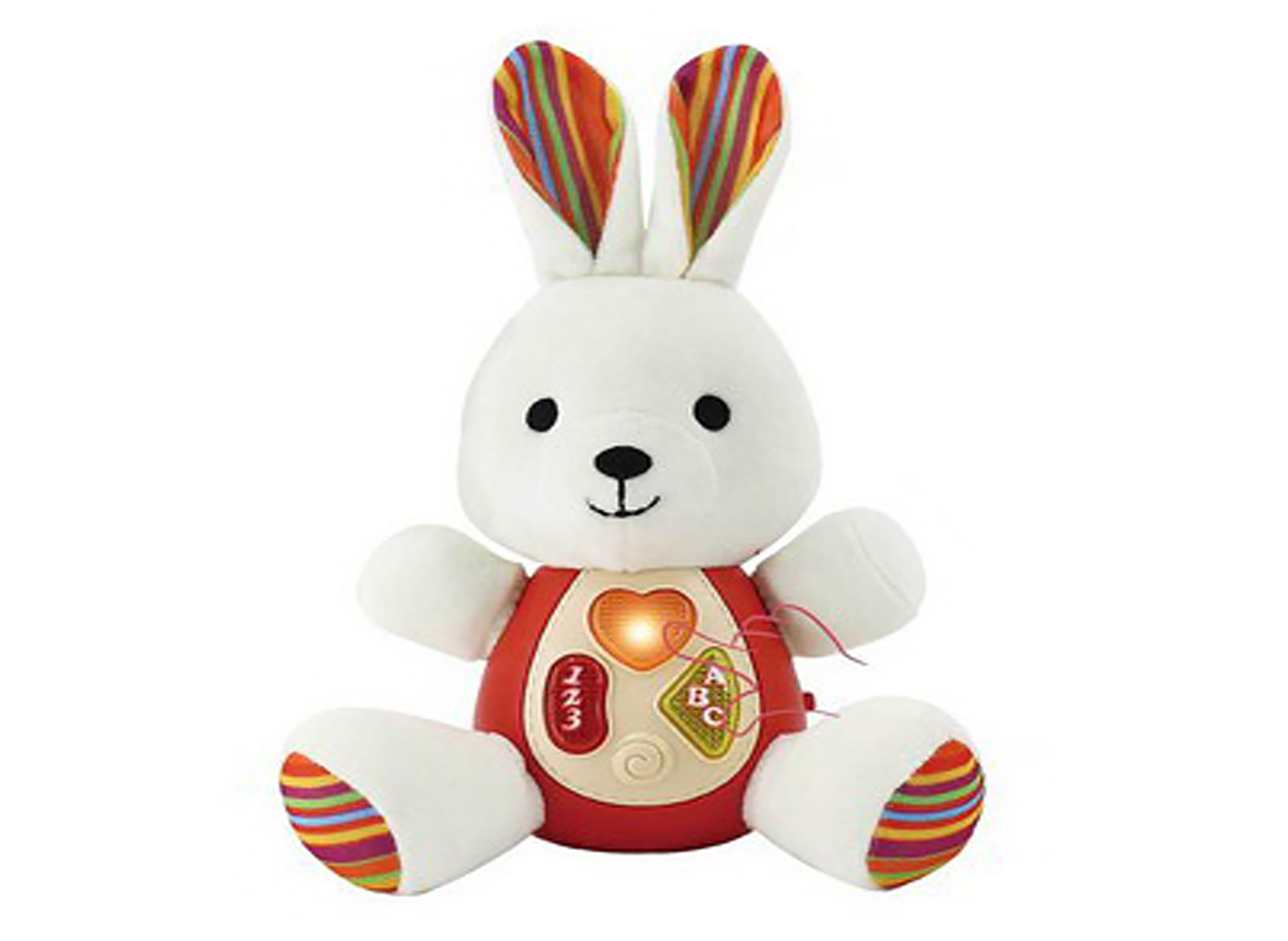 Králík interaktivní pro nejmenší s efekty. Rozměry 22,5x11,5x18,2 cm. ON/OFF přepínač na straně králíka. Plyšový s plastovým bříškem. Aktivace tlačítky na bříšku - světelné efekty, zvukové efekty a melodie. Baterie 2xAAA, nejsou součástí.