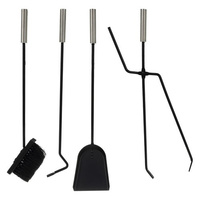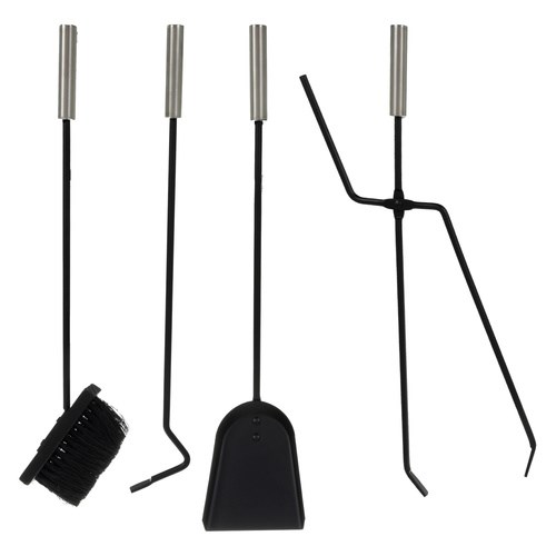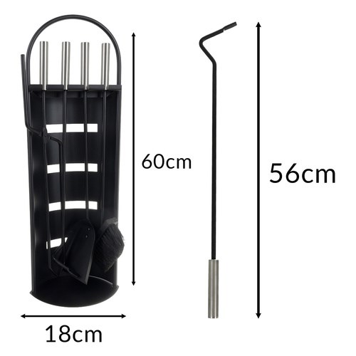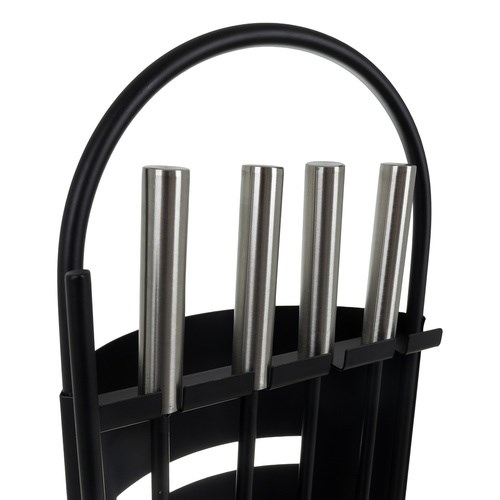 Sada 5v1 – balení obsahuje všechny nástroje potřebné k obsluze krbů a jiných ohnišť: kleště, lopatku, smetáček a pohrabáč. Vše je úhledně uloženo na kovovém stojanu.
