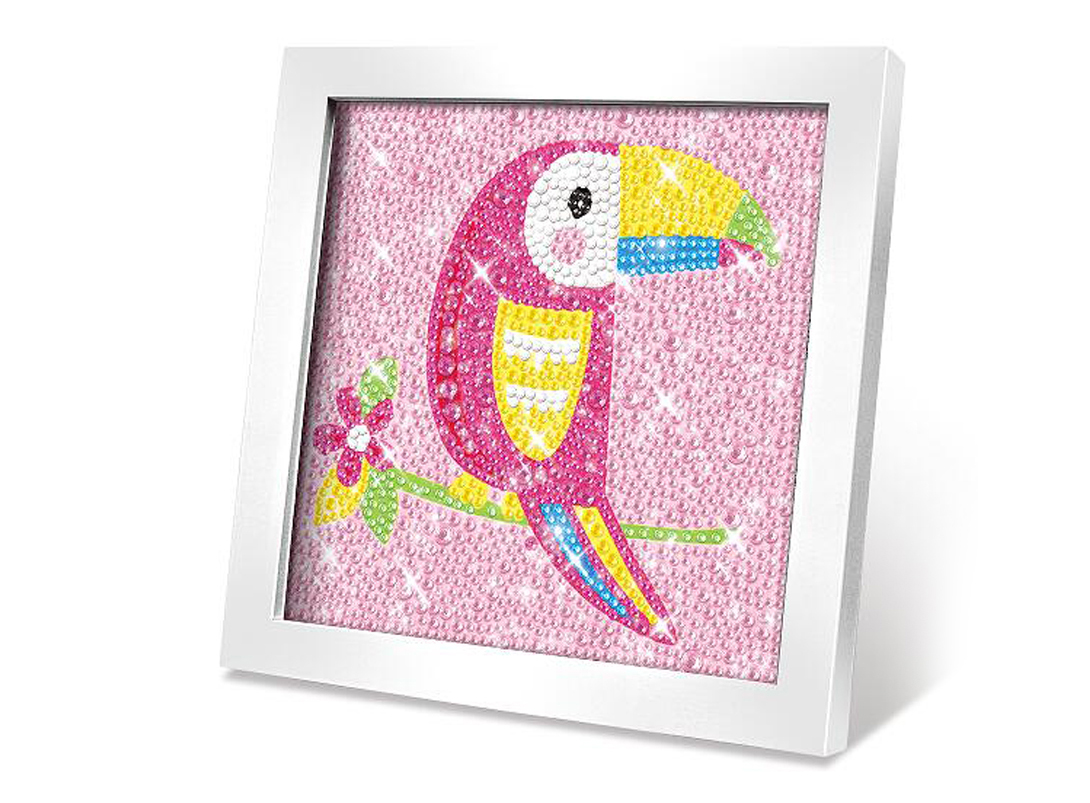 Kreativní set obraz s kamínky papoušek. Velikost 17,5x17,5x1,5 cm. Obsha balení - miska na kamínky, pero na nabírání a umísťování kamínků, kamínky různých barev, vosk, rámeček. Postup: z obrázku sloupněte folii, špičku přiloženého pera přiložte na vosk, perem naberte kamínek, umístěte ho na obraz.