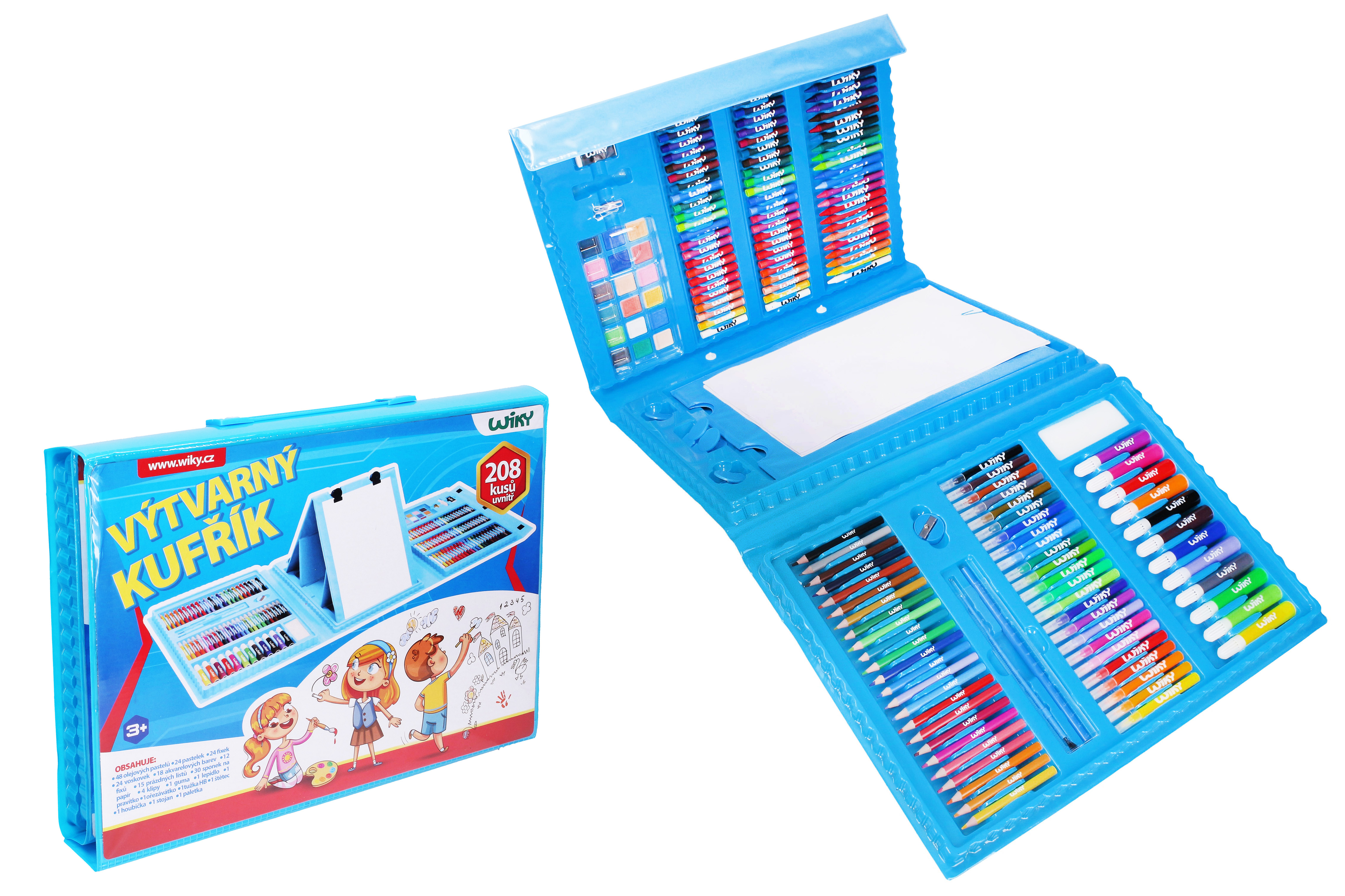 Obsahuje: 48 olejových pastelů, 24 pastelek, 24 fixek, 24 voskovek, 18 akvarelových barev, 12 fixů, 15 prázdných listů, 30 sponek na papír, 4 klipy, 1 guma, 1 lepidlo, 1 pravítko, 1 ořezávátko, 1 tužka HB, 1 štětec, 1 houbička, 1 stojan, 1 paletka.