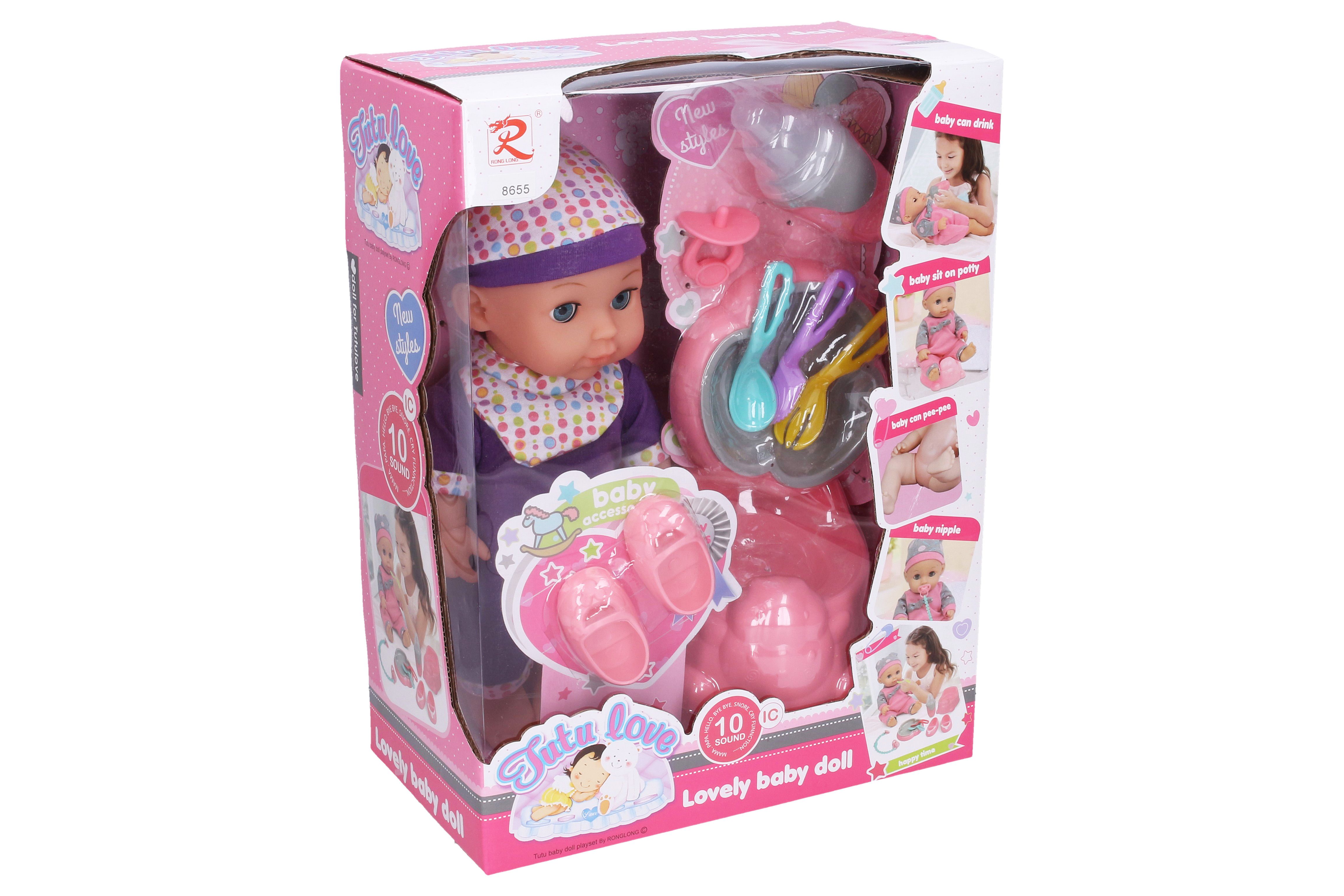 Miminko čurající. Velikost 30cm. Miminko pije z lahvičky, čurá, zavírá oči při položení na záda. Obsahuje panenku, nočník, talířek, příbor, lahvičku, dudlík. Vydává zvuky. 3xAG13 baterie součástí balení.