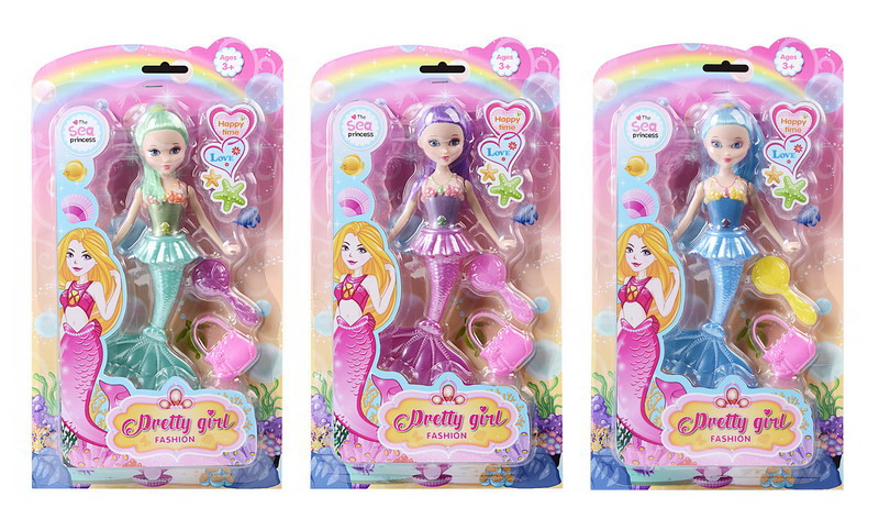 Mořská víla s doplňky. Velikost 21 cm. Součástí víla, hřeben, kabelka. 3 barevné varianty ploutve - zelená, růžová, modrá.