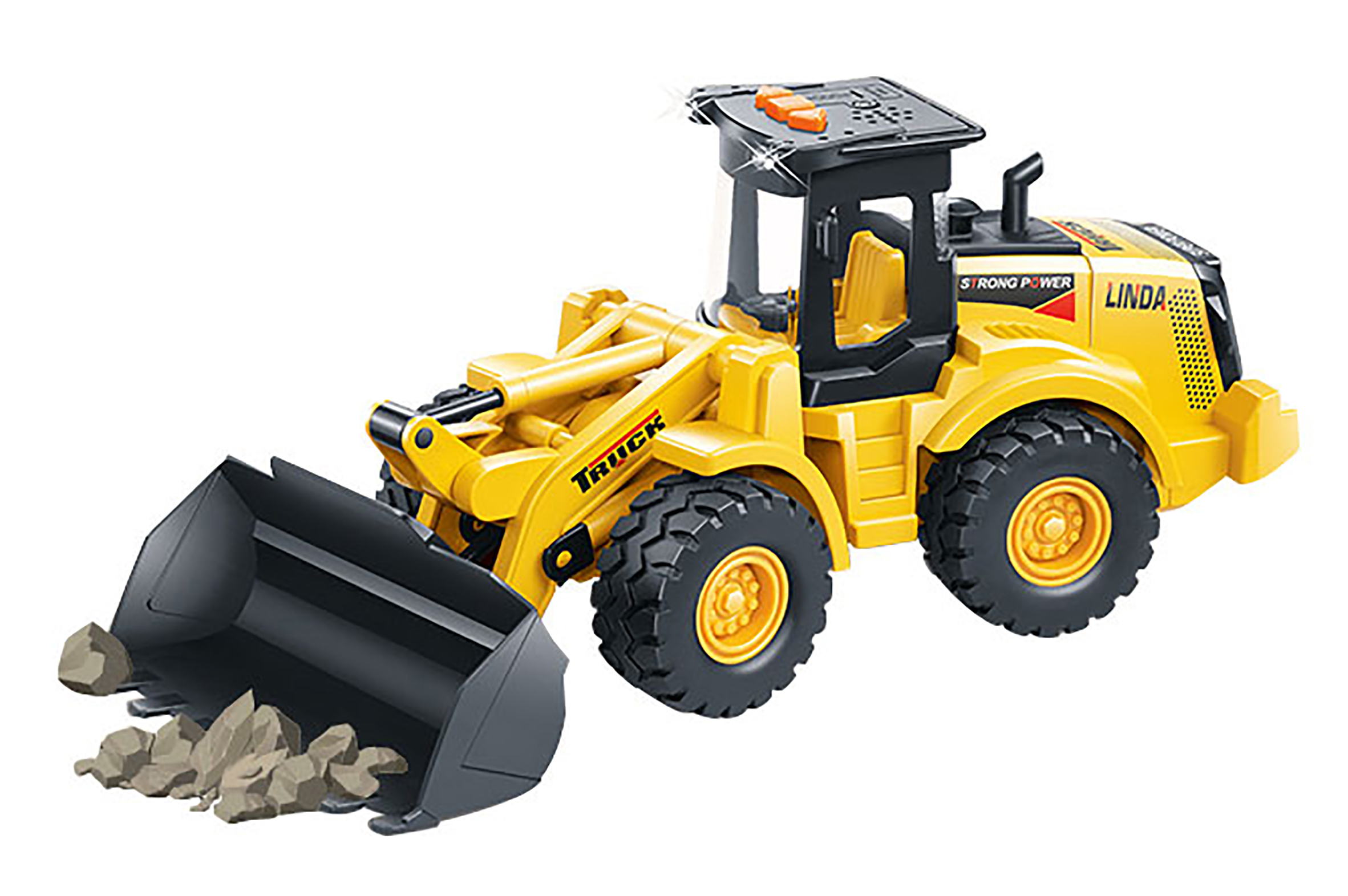 Nakladač na setrvačník s efekty. Rozměry 35x11x13 cm. S pohyblivou radlicí. Na setrvačník. Vydává světelné a zvukové efekty. Aktivace tlačítky na střeše. 3xAG13 baterie, součástí balení.