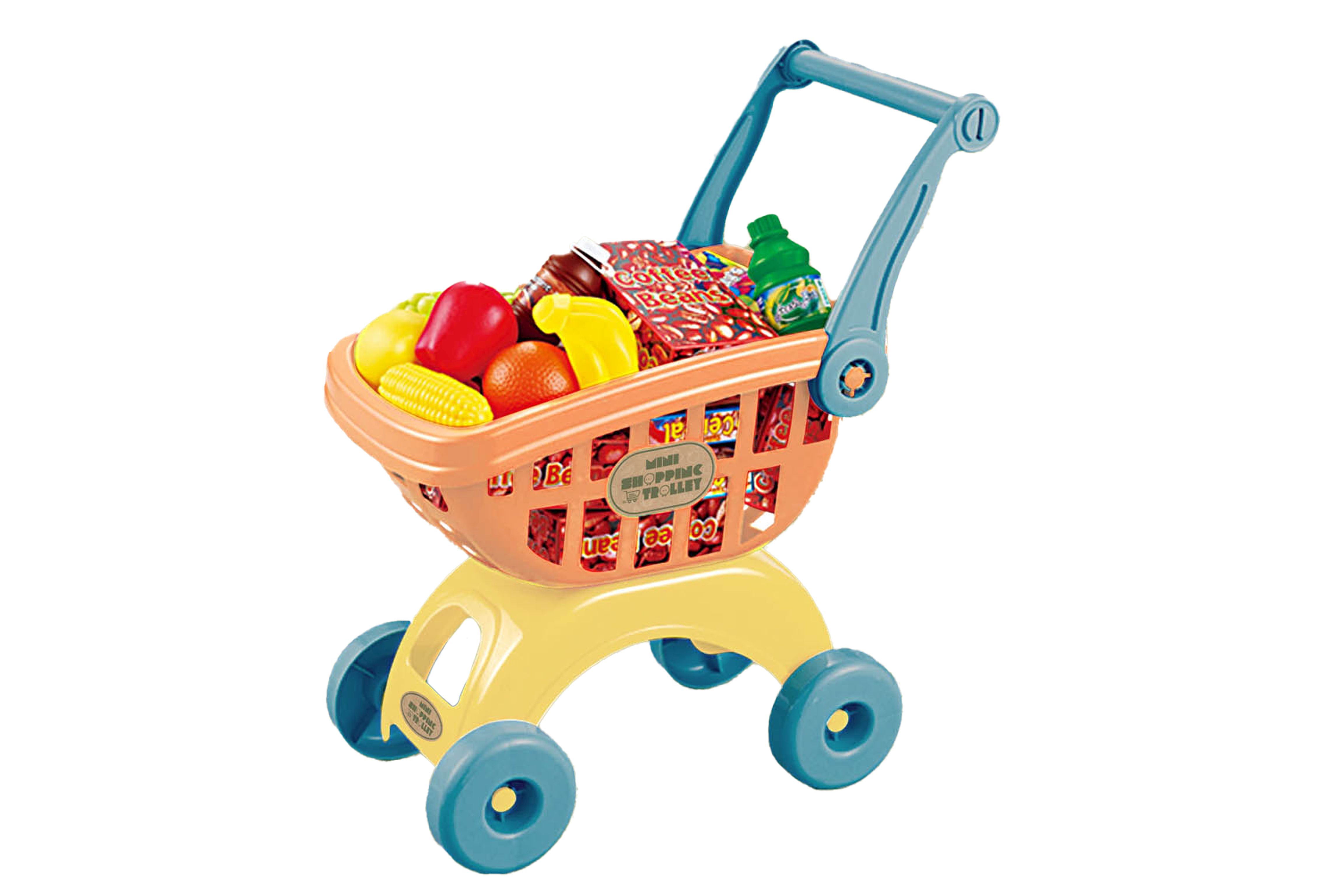Nákupní vozík s potravinami Bioplastic. Nákupní vozík, ovoce, zelenina, džus, brambůrky, cookies. Velikost 41,5 cm.
