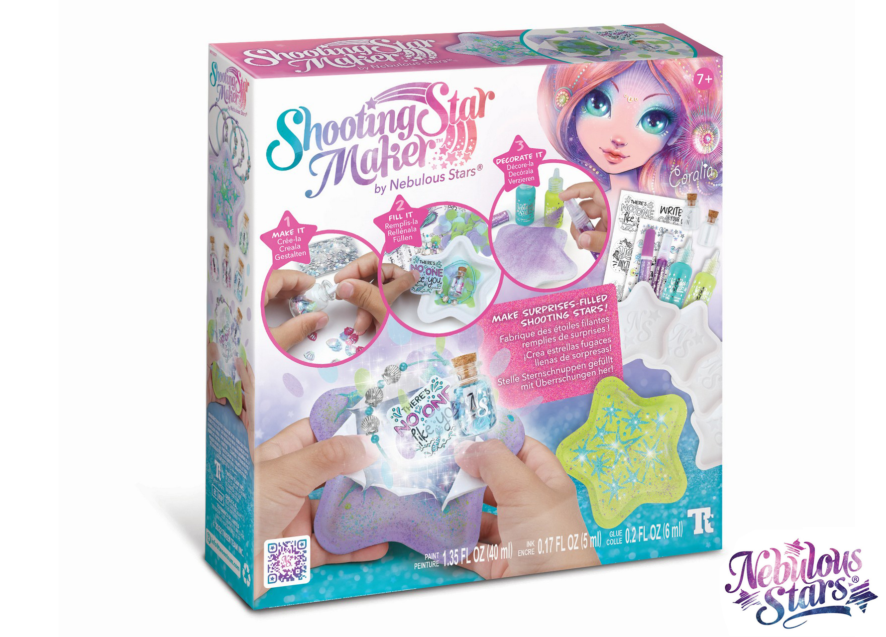 Nebulous Star Sada na výrobu létajících hvězd Coralia. Obsah balení: 10 hvězd z papírové hmoty, 5 mini lahviček, 2 lahvičky s barvou, lahvička s inkoustem ve spreji, 6 stránek s inspirativních vzkazů, flitry a třpytivý prášek, papírové konfety, lepidlo, 40 korálků, 5 provázků, stránka s nálepkami, štětec, plastová hůlka, Coraliin příběh, pokyny.