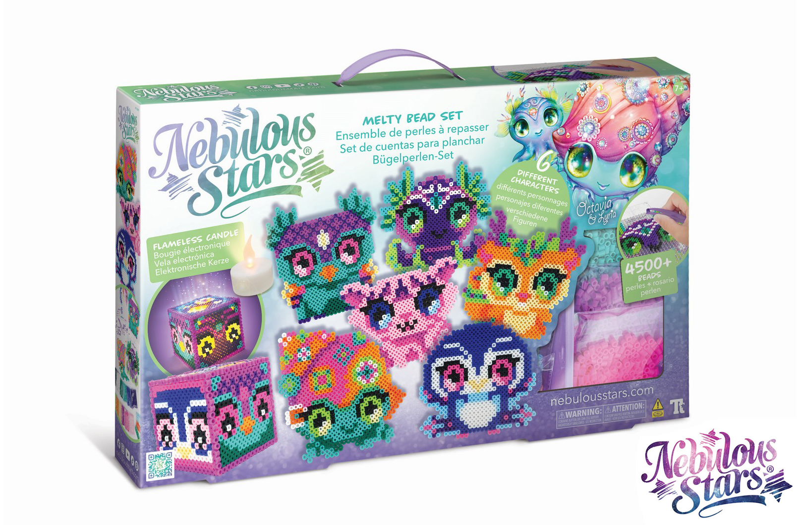 Nebulous Star Sada tavných pixelových korálků. Obsah balení: deska na tavné korálky, 11 karet se vzorem, 4500+ tavných korálků, LED svíčka, plastová pinzeta, nažehlovací papír, příběh zvířátek Animoulous, pokyny.