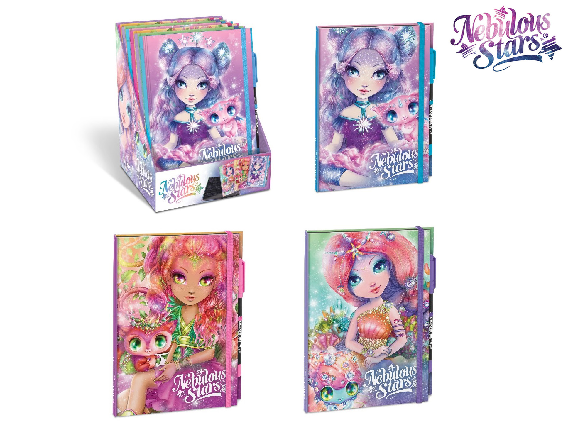 Nebulous Stars Deníček s černými stránkami. Rozměry 20,1 x 15,2 cm, 112 černých stránek. Balení obsahuje deníček a gelové pero. Display box - 6 ks. 3 varianty - zelená, fialová, modrá.