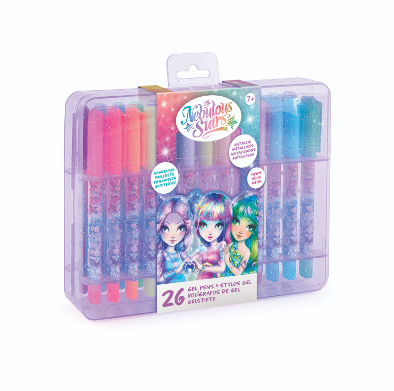 Nebulous Stars Gelová pera set. Plastový kufřík, který obsahuje 26 gelových per. Třpytivé neonové barvy. 9 per s třpytivým gelem, 8 metalických per, 8 neonových per, 1 černé gelové pero. Display box - 6 ks.