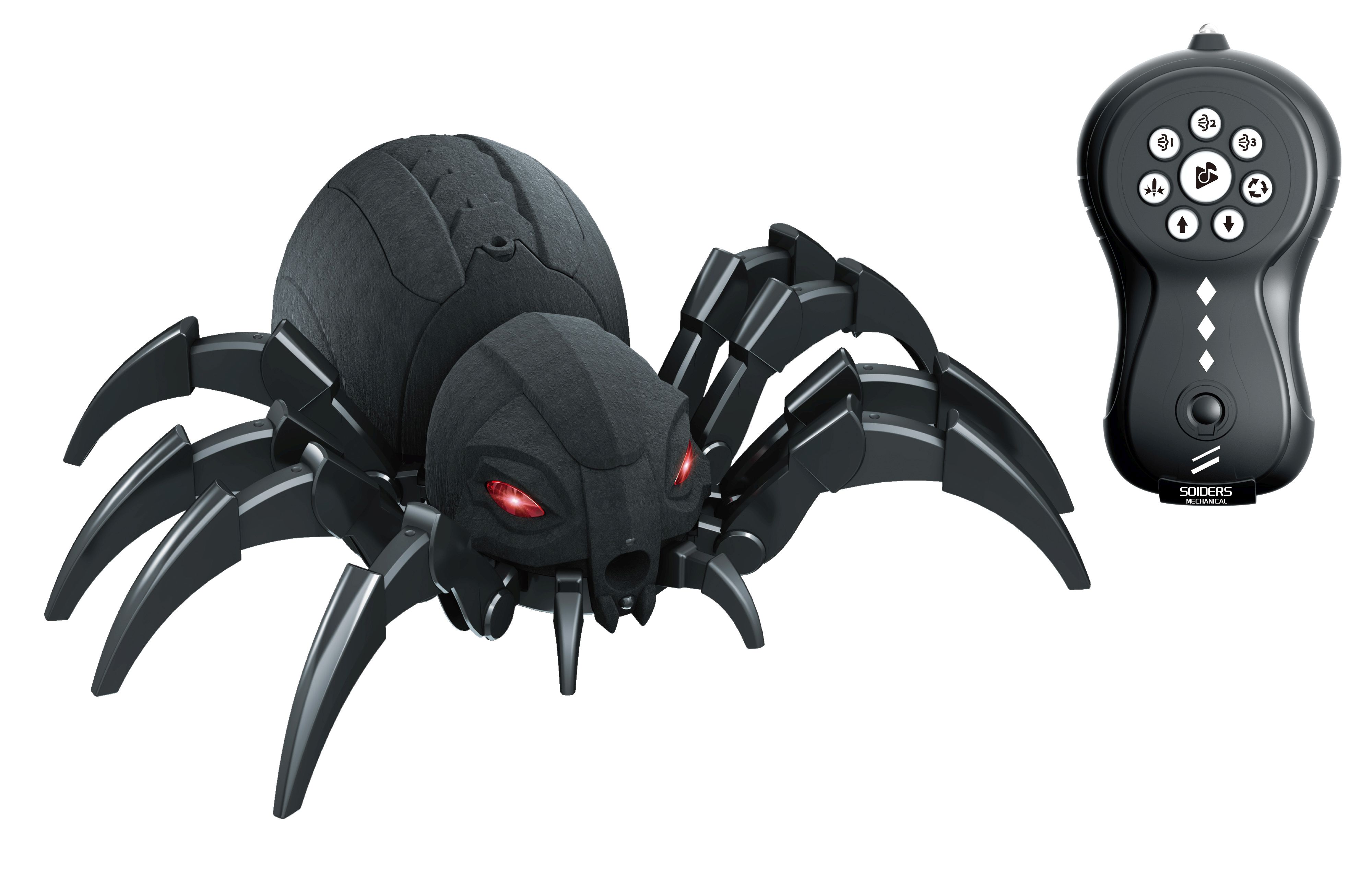 Pavouk kouřící RC na dálkové ovládání. Rozměry 30x28x10 cm. Frekvence 2.4GHz. Světelné, zvukové a kouřové efekty. Tlačítka na ovladači - chůze dopředu, dozadu zatáčí, 3 módy kouřových efektů, 2 demo režimy, zvuk. 3.7V bateriový pack do pavouka součástí, 2xAA do ovladače nejsou součástí. Nádržka na vodu na spodní straně pavouka. USB kabel, nádobka na vodu součástí.