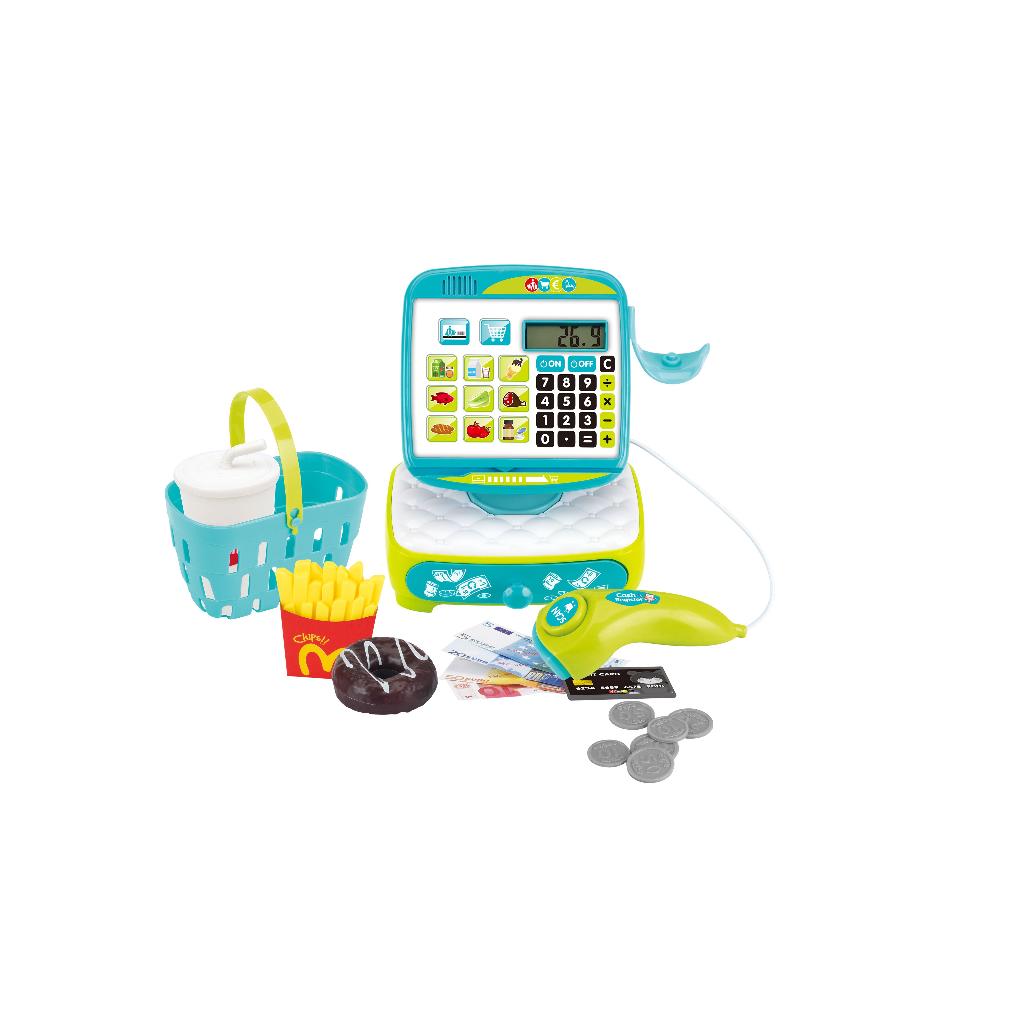 Pokladna. Velikost 22,5x15x22 cm. Obsahuje pokladnu, košík s potravinami, peníze a kreditní kartu. Pokladna funguje jako kalkulačka. Má vysunovací šuplík na peníze. Světlené a zvukové efekty. 2xAA baterie nejsou součástí.