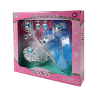 Proměň se v opravdovou princeznu! Tato krásná sada obsahuje vše, co malá parádnice potřebuje ke svým pohádkovým dobrodružstvím. Elegantní střevíčky, korunku, náušnice, prstýnek a kouzelnou hůlku. Díky stříbrno-modré barevné kombinaci působí celý set velmi slavnostně a okouzlujícím dojmem. Hodí se nejen na hraní doma, ale i na karnevaly, narozeninové oslavy či dětské párty.