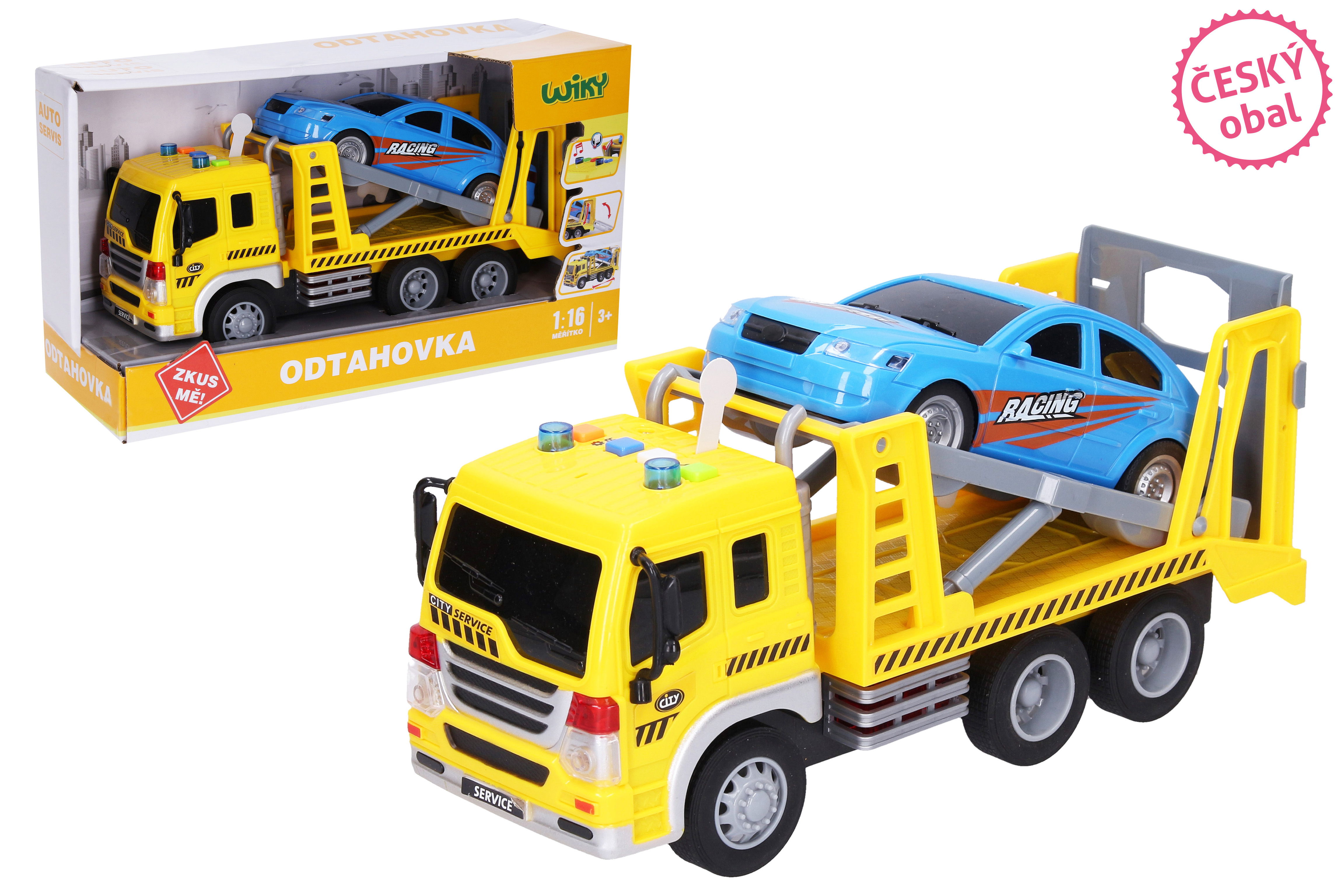 Tahač s autem. Rozměry tahače 26x10x14 cm. Na setrvačník. Světelné a zvukové efekty tlačítky na kabině tahače. 3xAG13 baterie součástí.