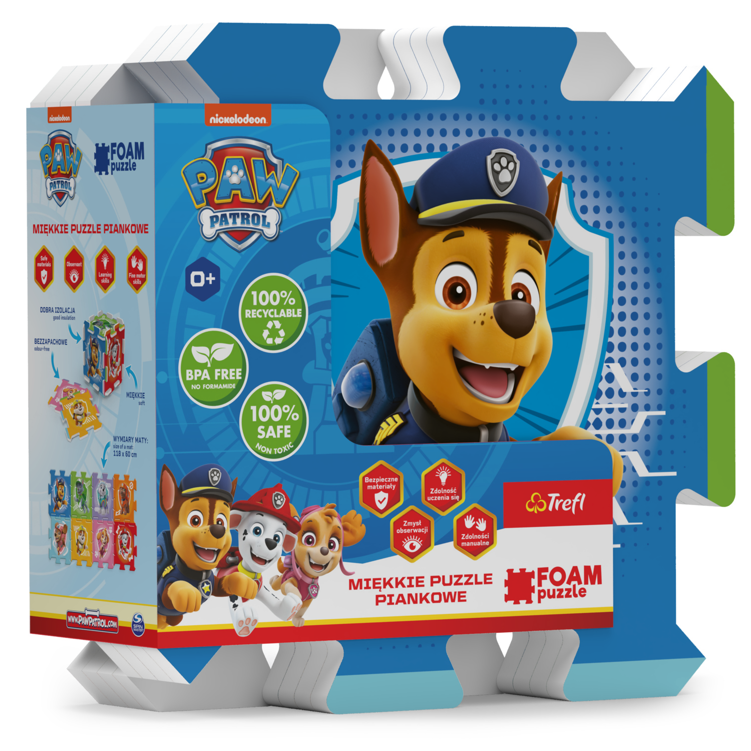 Trefl PĚNOVÉ PUZZLE - Paw Patrol. Licenční pěnové puzzle. Obsahují 8 velkých částí, jsou měkké, barevné, snadno omyvatelné a dají se z nich stavět 3D tvary, např. kocka nebo krabice. Mohou být také použity jako podložka na hraní. Pěnové puzzle rozvíjí dětskou představivost a pomáhají dětem učit se barvy a tvary. Jsou vyrobeny z netoxického materiálu, BPA free.
