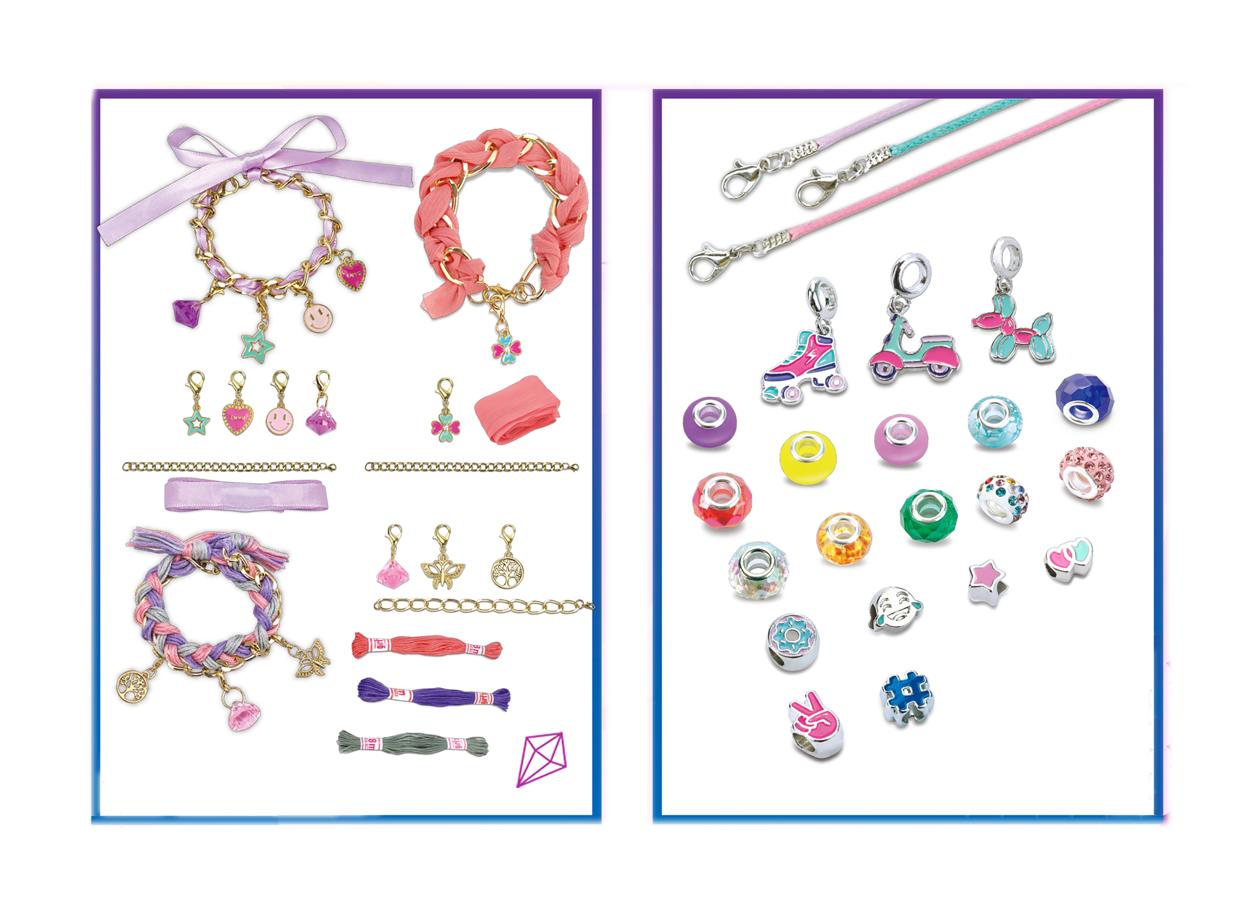Tvorba šperků set. Obsahuje kovové náramky, přívěšky, navlékací korálky, šňůrky a mašličky na tvorbu náramků.