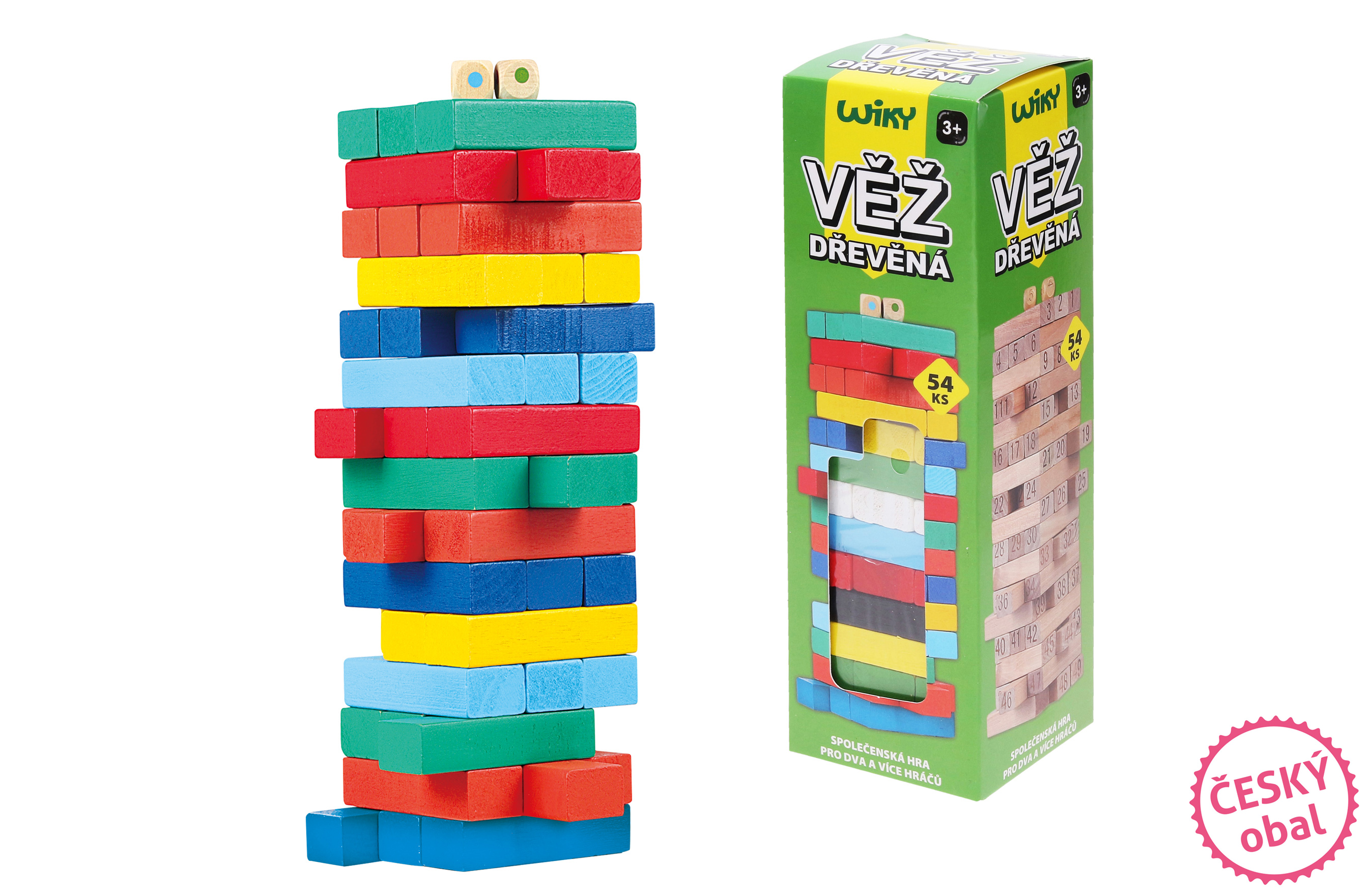 Věž dřevěná barevná. 54 dílků. Rozměry poskládané věže 6,3x6,3x20 cm, jednoho dílku 6,3x2,1x1,1 cm. Český obal.