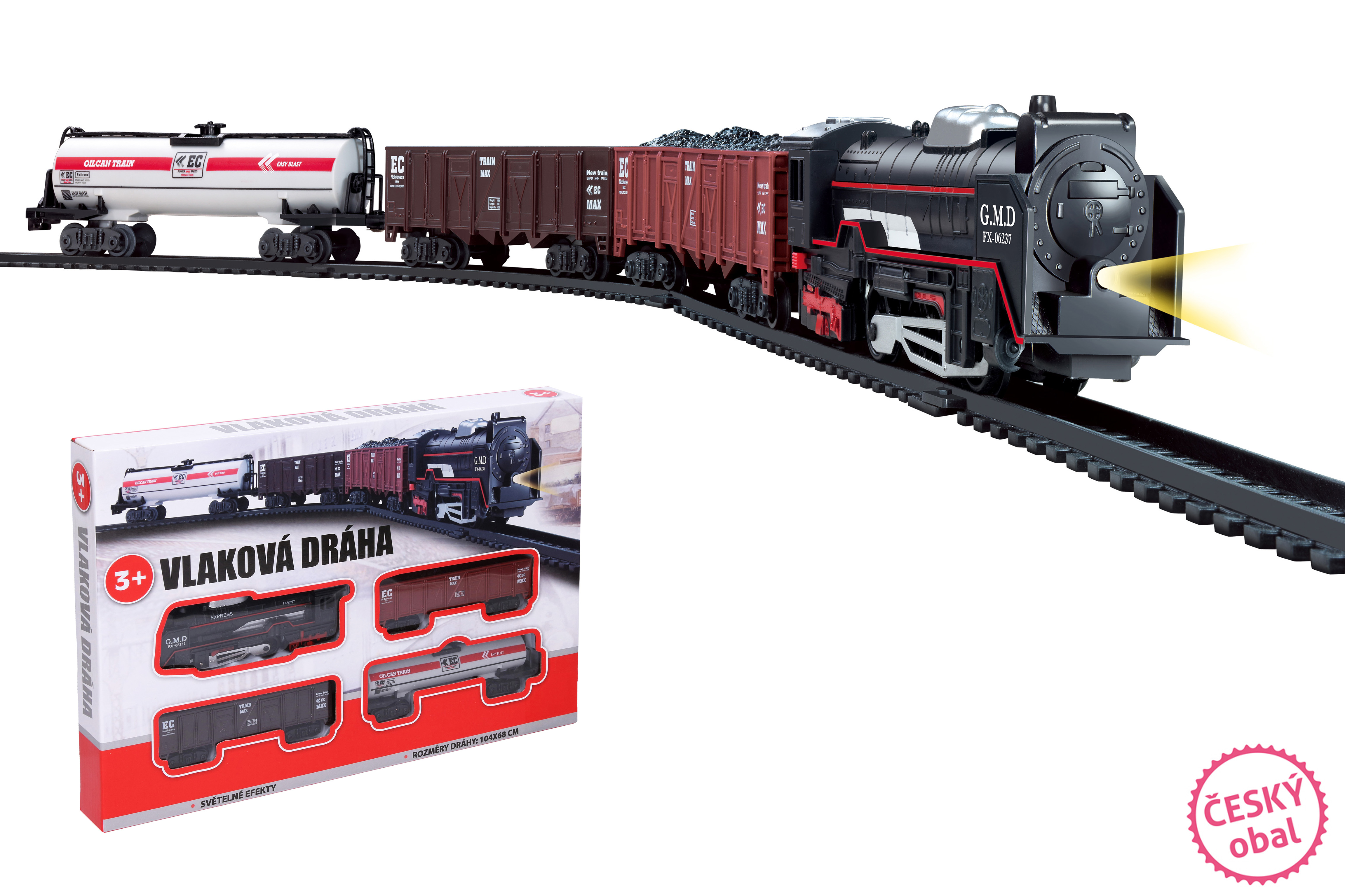 Vláček set malý. Rozměry složené železnice 104x68 cm. Délka tratě 280 cm. Světelné efekty. 2 x AA baterie do mašinky nejsou součástí.